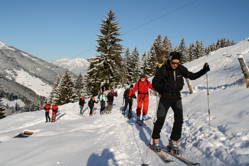 Gestern hat es 5 bis 10 cm Neuschnee gegeben. Der ist in diesem Jahr aber auch dringend notwendig. Bei bestem Wetter mit Sonne pur machten wir uns auf den Weg. Vom Parkplatz geht es in Richtung Osten zuerst über sanfte Hänge an einer Alm vorbei bis zur Lugeralm auf 1471m. Zwischendurch waren wir auch gleich für unseren Fotokurs ein hoffentlich perfektes Fotomotiv. Nachdem es sich im Vorfeld schon herumgesprochen hatte, dass die Kollegen am selben Berg unterwegs sein werden, haben viele von uns extra etwas Rotes angezogen. Denn rote Jacken sind bei den Fotografen immer sehr begehrt.